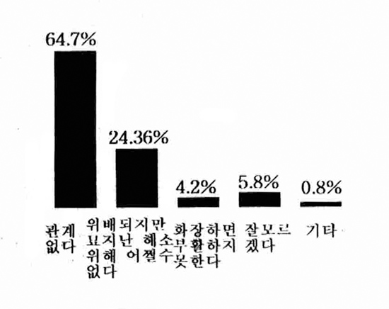 그러나 극소수이긴 하지만 그렇게 심각하지 않다, 전혀 문제가 되지 않는다는 응답도 각각 1.6%씩으로 나타나기도 했다.