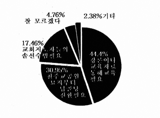 특히 이 질문에서는 여성 응답자의 25%가 교회 지도층의 앞장을 지적했으며 남성신자의 경우 교회 공원묘지의 조속한 납골당 전환을 요구하는 성향을 각각 보였다.