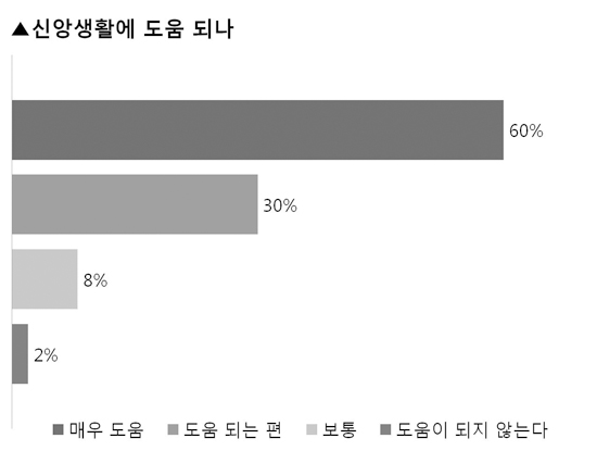 또한 가톨릭 어플리케이션이 신앙생활에 도움이 된다고 생각하느냐는 질문에는 90% 이상의 응답자가 도움이 된다고 답해 가톨릭 어플리케이션 활용에 대해 긍정적으로 평가하는 것으로 드러났다.