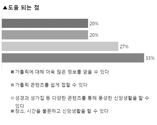 특히 응답자들은 가톨릭 어플리케이션을 활용함에 따라 장소와 시간을 불문하고 신앙생활을 할 수 있어(33%) 많은 도움을 받고 있다고 답했다. 이어 성경과 성가집 등 다양한 콘텐츠를 통해 풍성한 신앙생활을 할 수 있다(27%), 가톨릭 콘텐츠를 쉽게 접할 수 있다(20%), 가톨릭에 대해 더욱 많은 정보를 얻을 수 있다(20%) 등의 답변을 골고루 선택했다.