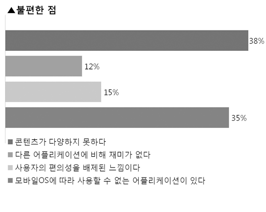 반면 가톨릭 어플리케이션 사용 시 불편한 점을 묻는 질문에 대해서는 콘텐츠가 다양하지 못하다(38%)와 모바일OS에 따라 사용할 수 없는 어플리케이션이 있다(35%)를 가장 많이 꼽아, 다양한 어플리케이션 개발에 교회의 관심이 필요함을 일깨워주고 있다.