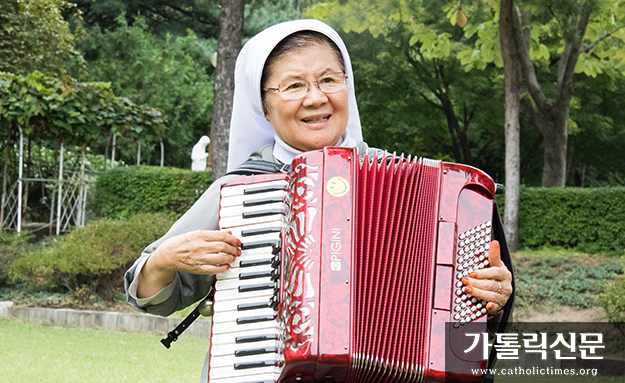 김현남 수녀가 출판기념회를 준비하며 9월 16일 성가소비녀회 본원 마당에서 아코디언을 연습하고 있다. 김 수녀는 한 곡을 완벽하게 연주하기 위해 500번가량 연습한다고 말한다.