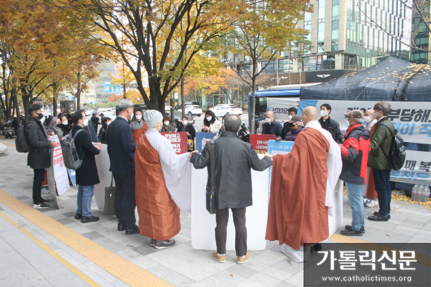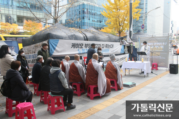 서울대교구 노동사목위원회(위원장 김시몬 신부)와 대한불교조계종 사회노동위원회, 한국기독교교회협의회 정의평화위원회는 11월 17일 오후 2시 서울고용노동청 앞 ‘아시아나케이오’ 농성장에서 ‘아시아나케이오 원직복직 촉구 3개 종교 기도회’를 개최했다.