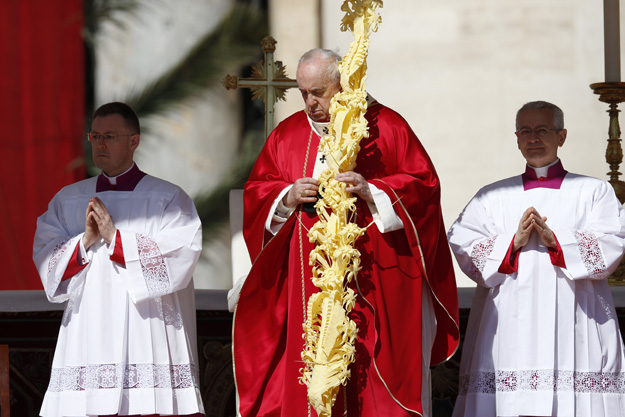 프란치스코 교황이 4월 10일 성지 가지를 들고 로마 성 베드로 광장에서 주님 수난 성지 주일 미사를 주례하고 있다.             CNS