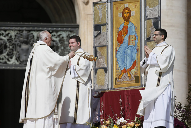 프란치스코 교황이 4월 17일 성 베드로 광장에서 주님 부활 대축일 미사를 주례하며 부활하신 예수 이콘에 분향하고 있다.             CNS