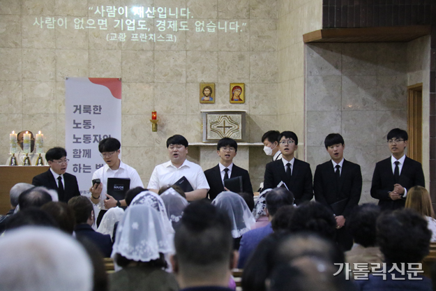 5월 7일 인천교구 제22회 노동자 주일 기념미사 중 인천가톨릭대학교 신학대학 동아리 밀알회 신학생들이 플랫폼노동자들을 격려하는 의미로 ‘누군가 널 위해 기도하네’를 부르고 있다.