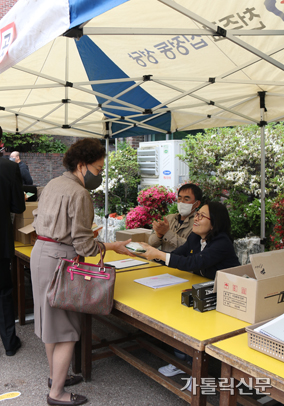 5월 7일 봉헌된 인천교구 제22회 노동자 주일 기념미사 후 사회교리 문헌 필사 참여 신자가 관계자로부터 기념품을 받고 있다.